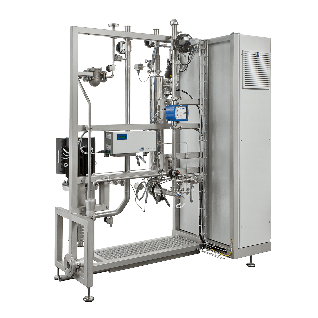 Preassembled on a compact frame, it is the cost-effective answer for storing, distributing, and monitoring the quality of WFI. The LOOPO H maintains the temperature in the entire storage and distribution system at the desired level. Cold withdrawals are provided with tap coolers if required.